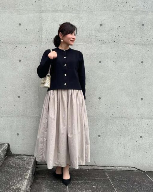 そこでおすすめなのがカーディガン×ボリュームスカートの組み合わせ。その際カーディガンの前を留めて着こなすと上半身がコンパクトにまとまり、全身のバランスが整います。フレアスカートやギャザースカートもスッキリ着こなせますよ。
