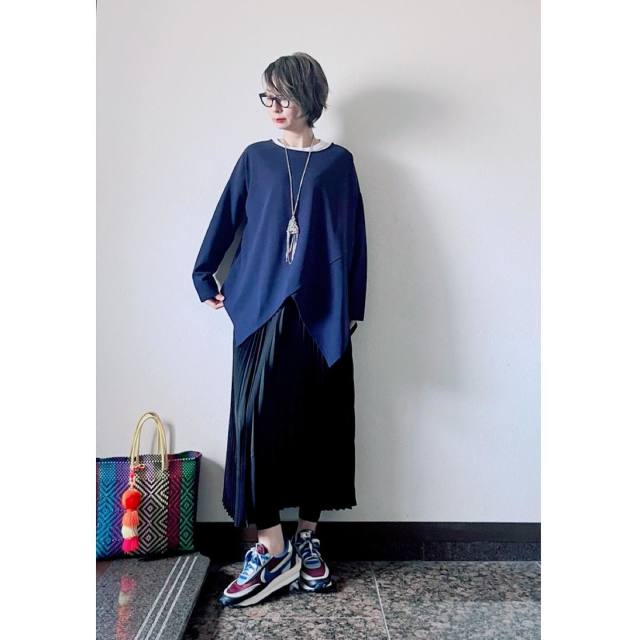 【50代の春スカート×カジュアルコーデ3】プリーツスカート×アシンメトリーTシャツ