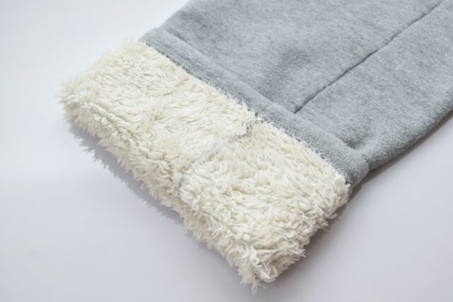 まずスウェットパンツの特徴は、裏側が「裏毛(うらけ)」と呼ばれるパイル地であること。スウェットパンツ独特の吸水性や柔らかな穿き心地は、ループ状に編み込んだニット生地がタオルと同じ構造になっているのが理由です。春用のスウェットパンツは、この裏毛のスウェットパンツを指します。