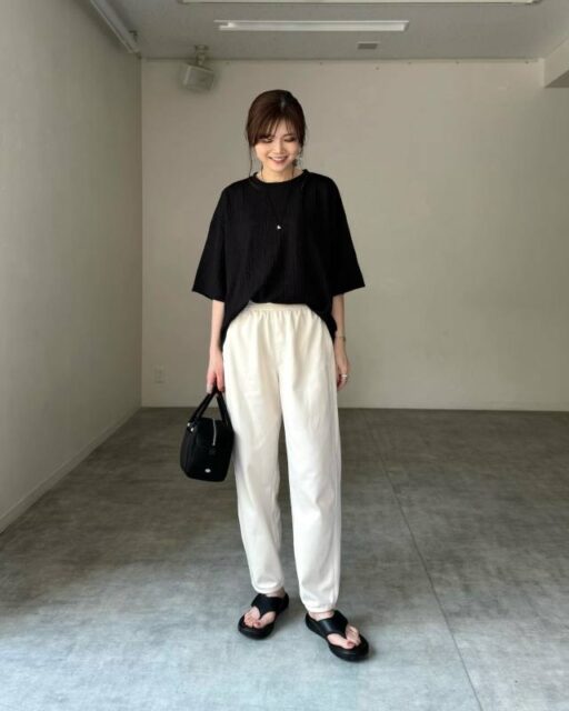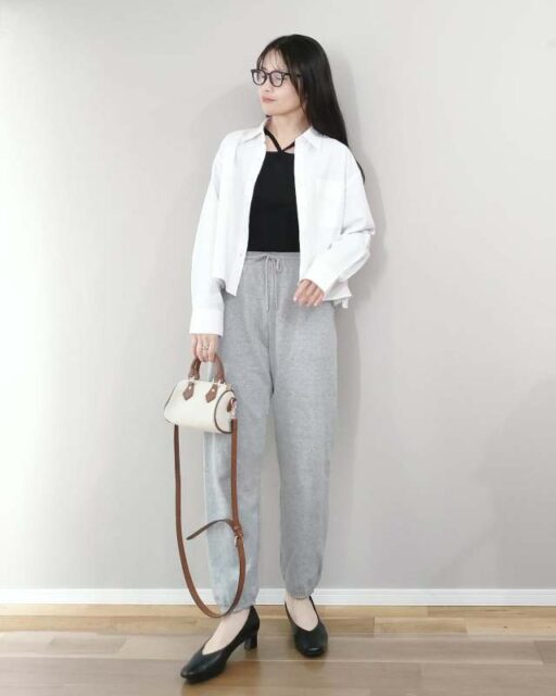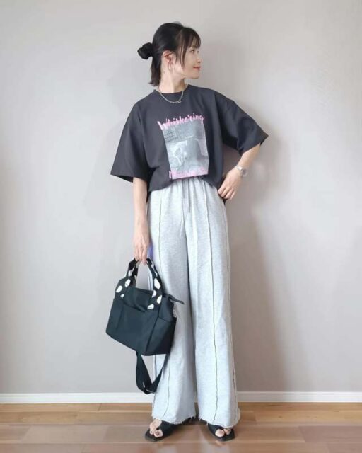 4月下旬頃になったら最高気温が23度を超える日も。長袖では暑いようなら、スウェットパンツに5分袖トップスを合わせてみて。