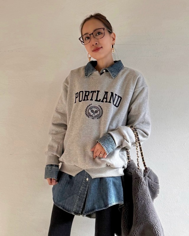 グレースウェット×シャツの重ね着コーデ