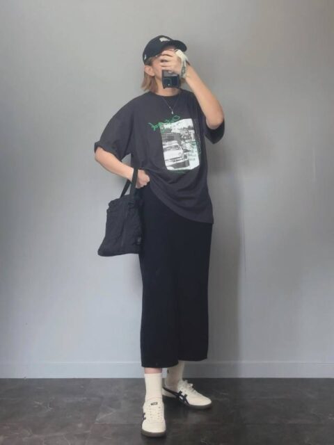 そこでおすすめなのがストレッチ性に優れたユニクロの黒タイトスカート。ゆったりシルエットのプリントTシャツを合わせてメリハリよく仕上げましょう。