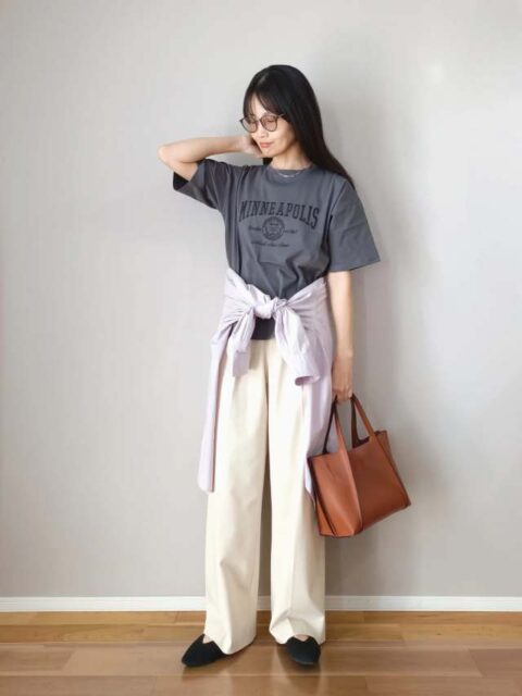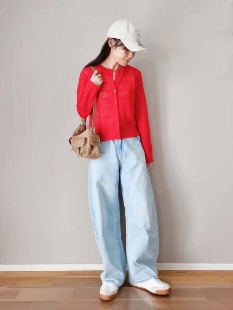 スナップではGU(ジーユー)のカラーカーディガンに、ユニクロのライトブルーワイドデニムパンツで軽やかさをプラス。動きやすさ抜群の好印象なコーデに仕上がります。