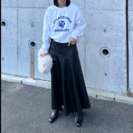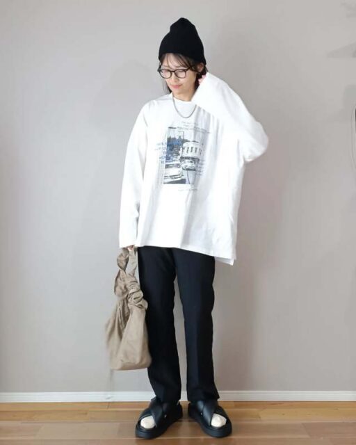 大人が着たいと探しても、なかなかベストなデザインが見つかりにくいロンT(長袖Tシャツ)。そんなときはオーバーシルエットなど、あえて普段よりサイズアップしてみると、いつもよりこなれた印象に仕上がりますよ。胸元ロゴのシンプルな白のロンTなら大人がクリーンなムードで着こなせます。