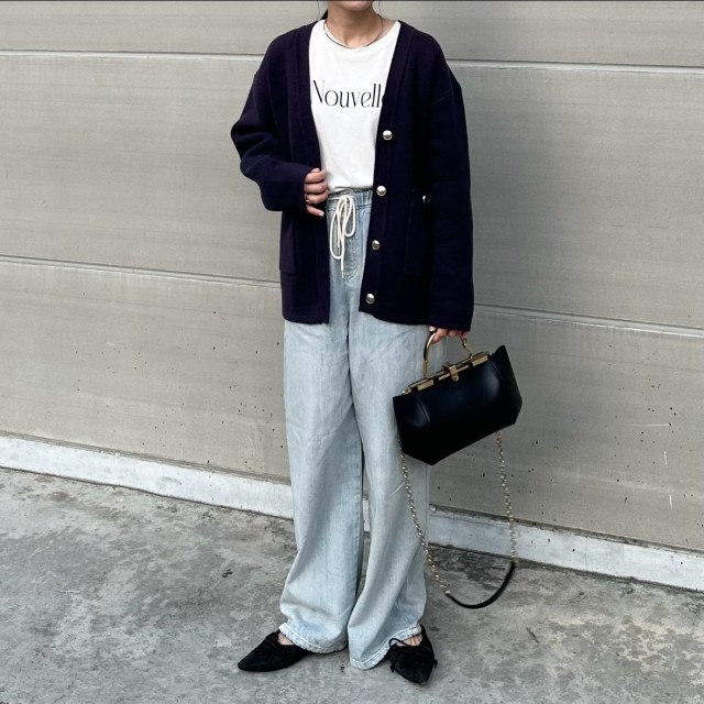 デニムパンツに合わせるときはウエストインしてすっきり着こなしましょう。メタルボタンが華やかなカーディガンとパンプスを合わせれば、大人のきれいめカジュアルに。