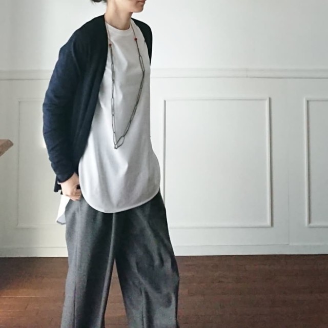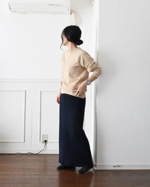 おすすめはスウェットや長袖Tシャツなどのラフなプルオーバー。ラクな上に袖がまくりやすいので、手洗いするときもスムーズです。ロングスカートやワイドパンツに合わせると、カジュアルなトップスが50代の装いに馴染みますよ。