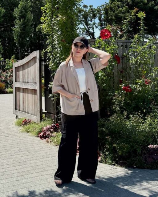 簡単にこなれた雰囲気の大人カジュアルに仕上がるのが、黒ワイドパンツと半袖ジャケットの着合わせ。インナーは白を選んで抜け感を出したら、ベージュのジャケットを羽織って軽やかに。コーデをベーシックカラーでまとめることで、黒ワイドパンツのシックな落ち着きはそのままに、春夏らしく軽快なムードにシフトします。