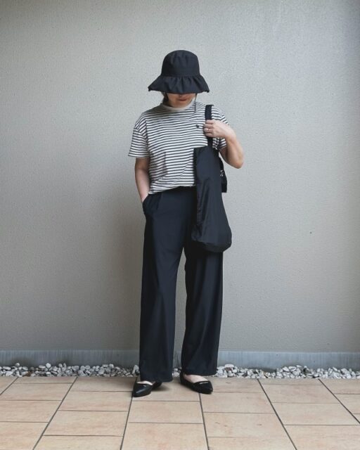 ボーダーTシャツ×黒ワイドパンツの着合わせは、ハットを被るなど小物をプラスすると好バランス。上下ともにベーシックな服だからこそ、小物でアクセントを付けるだけでメリハリが生まれます。