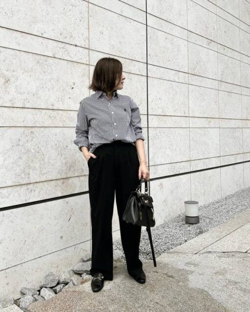 きれいめにスタイリングするときはストライプシャツをチョイス。ストライプ柄の縦ラインのおかげですっきり見え、シャープな印象に仕上がるのが大人に嬉しい一枚です。