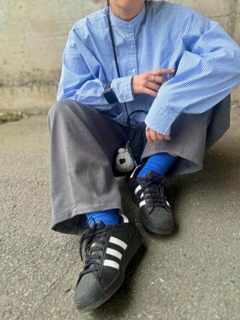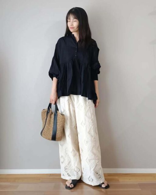 ちなみにダボッとしたパンツとのコーデもおすすめ。ワイドパンツがのっぺり見えずおしゃれに着こなせますよ。