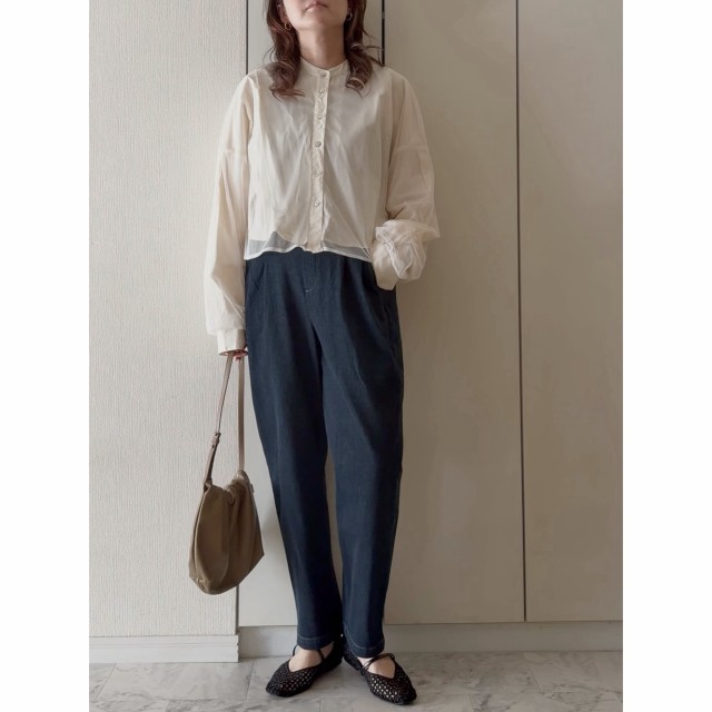 パンツコーデが軽やかに「スタンドカラーのシアーシャツ」