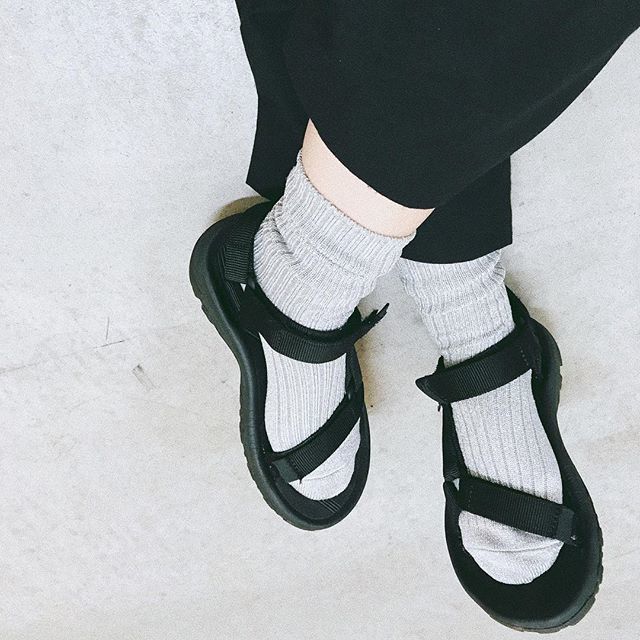 おしゃれ上級者さんらしいファッションに仕上がるのが「ヒールサンダル×靴下」の重ね履き。ヒールサンダルは靴下が似合わなさそうですが、ゆるっとしたパンツを合わせると着こなしやすいですよ。靴下の上部をパンツでさりげなく隠すことでコーデが落ち着き、普段使いしやすくなります。