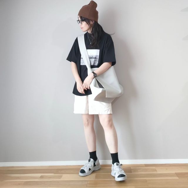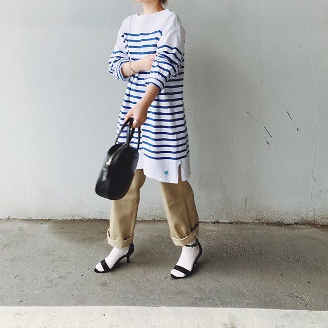 さらに全体をカジュアルな服でまとめるのがコツ。そうすると靴下が浮いて見えません。