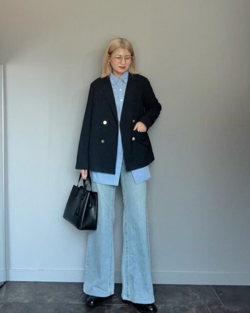 テーラードジャケットなら羽織るだけで上品さがプラスできますよ。カチッとし過ぎていないストレッチ性に優れた素材や、ウォッシャブル仕様のジャケットなら気負わず取り入れられるはず。ジャケットの下はブルーのシャツ×デニムパンツでカラートーンを合わせると、洗練ムードたっぷりな仕上がりに。