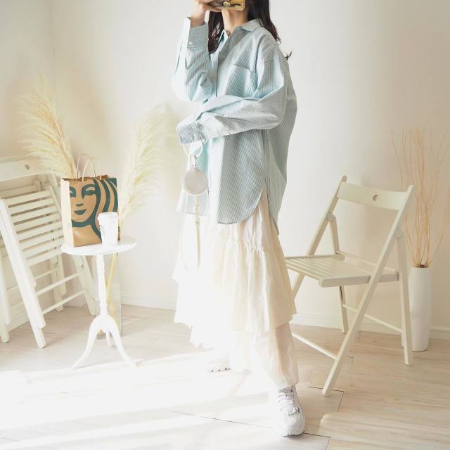 5月中旬のUSJの服装でイチ押しなのがシャツワンピース! サラリとした質感が5月のムードに似合います。インにパンツを重ねて今っぽくコーデしても素敵♪