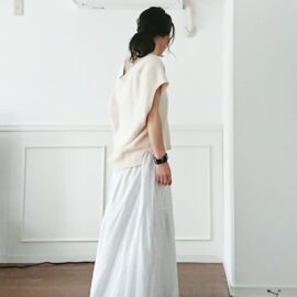 気温30度前後の時期は「ノースリーブのサマーニット」が最適。薄手でざっくりした網目のサマーニット生地は通気性がよく、汗がこもりにくいですよ。