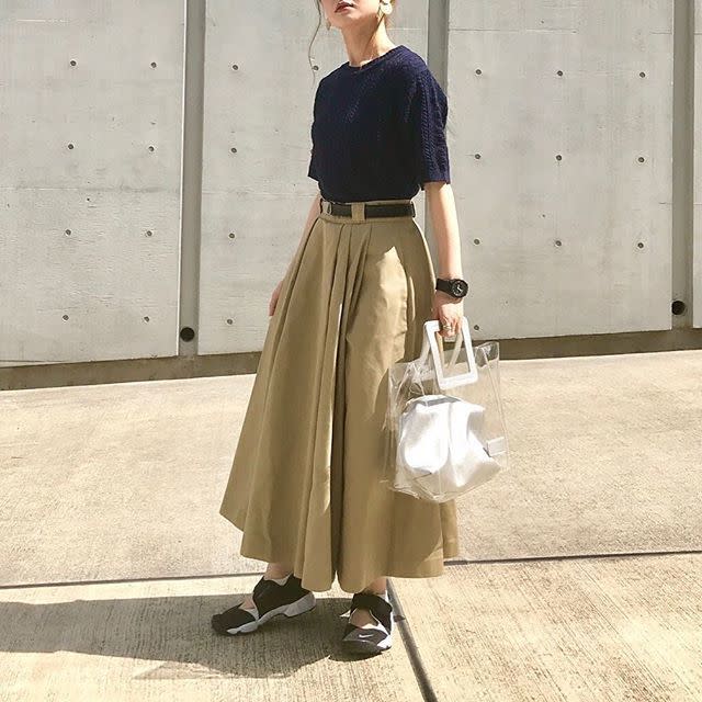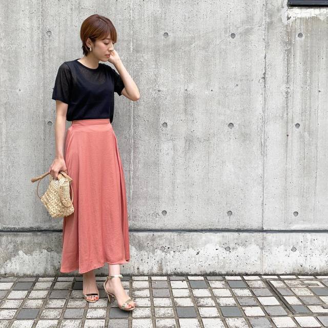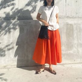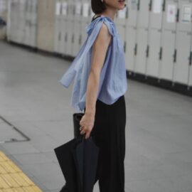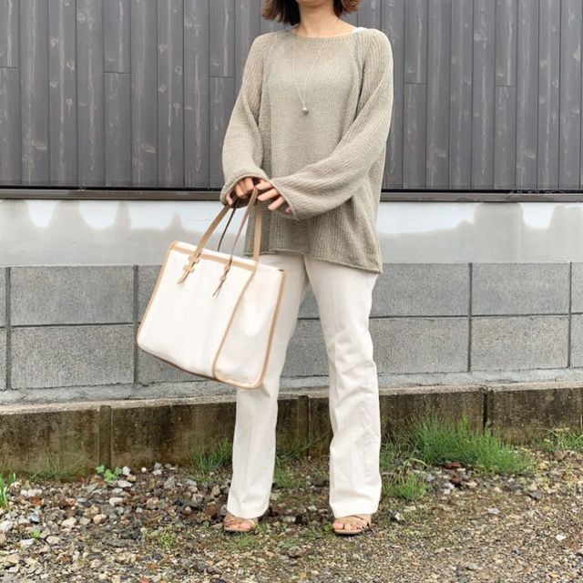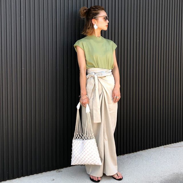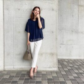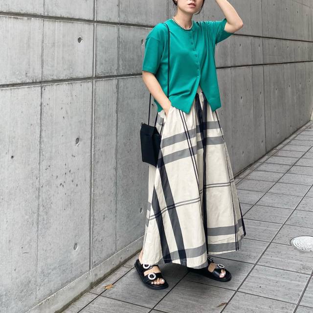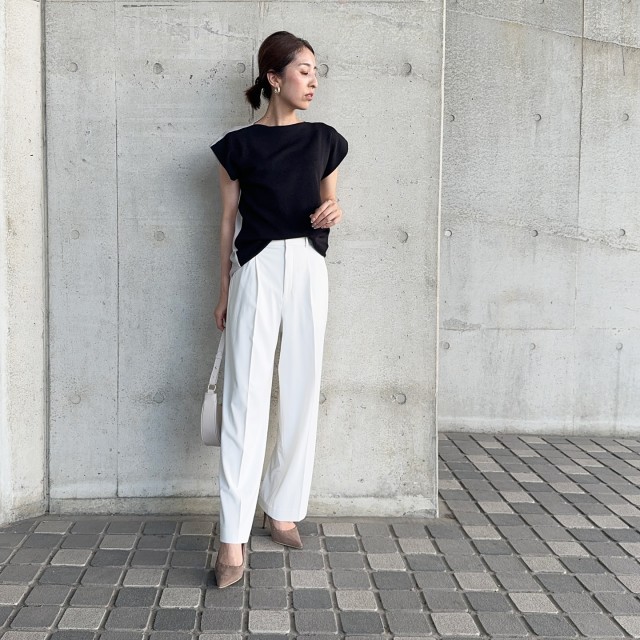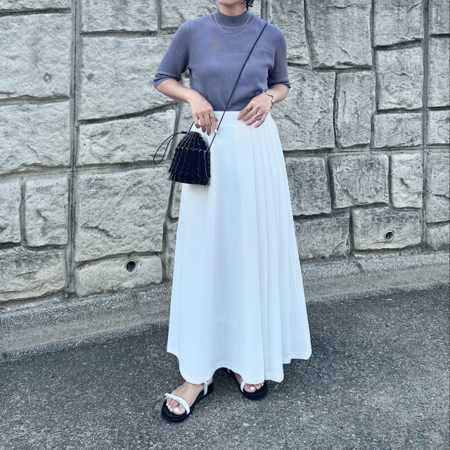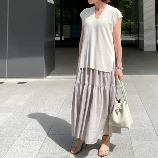 また大人にとってフレンチスリーブは二の腕が気になるものですが、サマーニットは生地そのものに落ち感があるため肩まわりが目立たず、二の腕の露出をカバーできます。気温が高い日の通勤コーデにもおすすめですよ。
