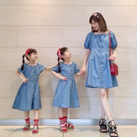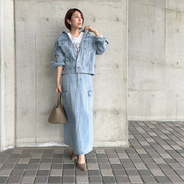 デニムオンデニムを少しフェミニンに仕上げたいときは、デニムジャケット×デニムスカートの組み合わせがおすすめ。ジャケットは下のボタンだけを留め、首元からロゴTシャツをチラリと覗かせるとこなれた印象に。ニュアンスカラーのバッグとパンプスを合わせれば、きれいめ感と程よい引き締め効果もプラスできます。