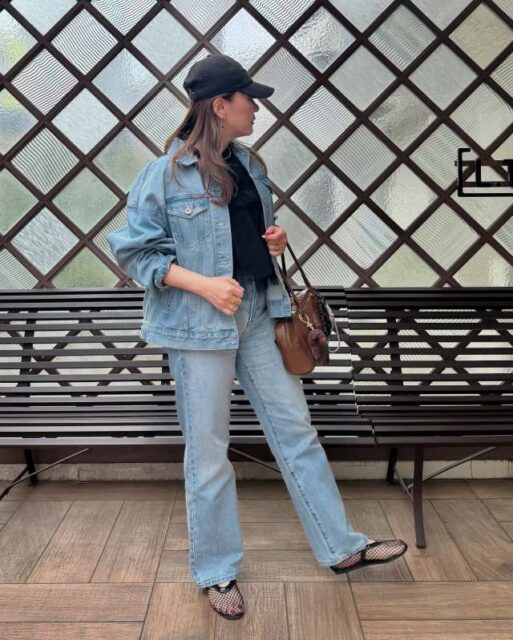 まずは失敗しにくい鉄板コーデからご紹介。同じ色味のデニムジャケットとパンツを合わせ、セットアップ風にまとめてみましょう。