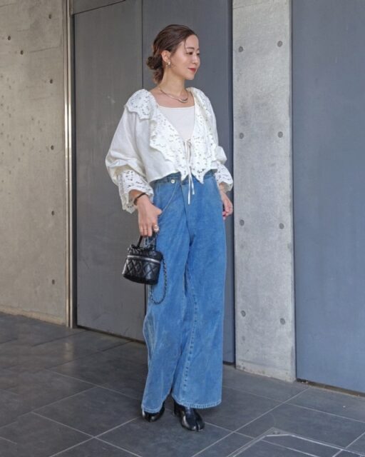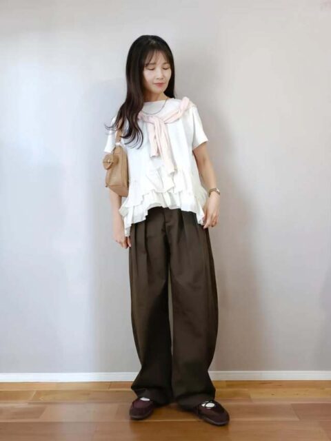 また今季のフリルは幅広いのが特徴。例えば裾に配置されたフリルは大きすぎない、ほのかに広がるデザインが人気。レイヤードとも相性バツグンです。表情を華やかに彩りたい人は首元フリル、気になる腕をおしゃれにカバーしたい方には袖元フリルがおすすめ。カラーは使いやすい白以外に、柔らかなピンクやブルーも流行中です。ピンとくる一枚は気軽にトライしてみてくださいね。