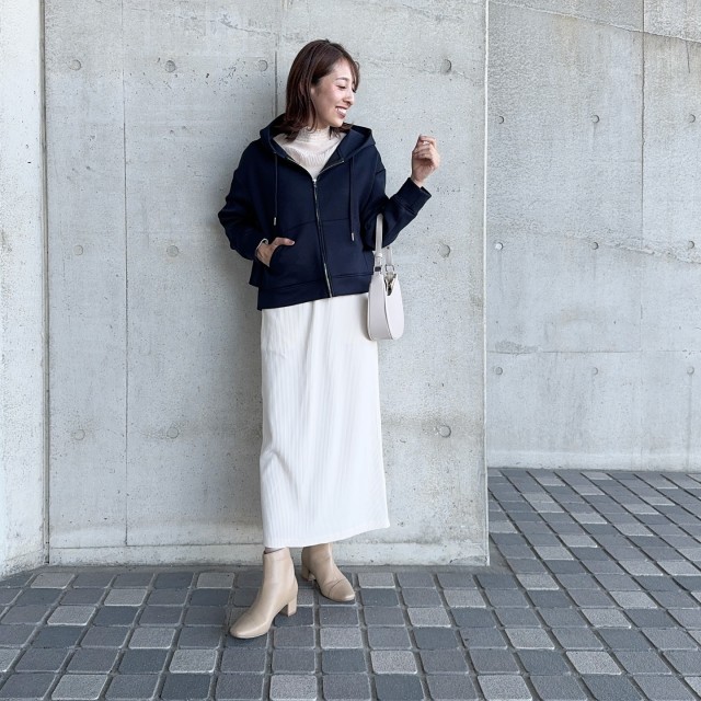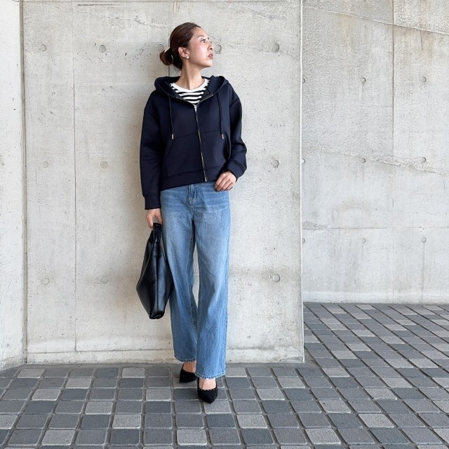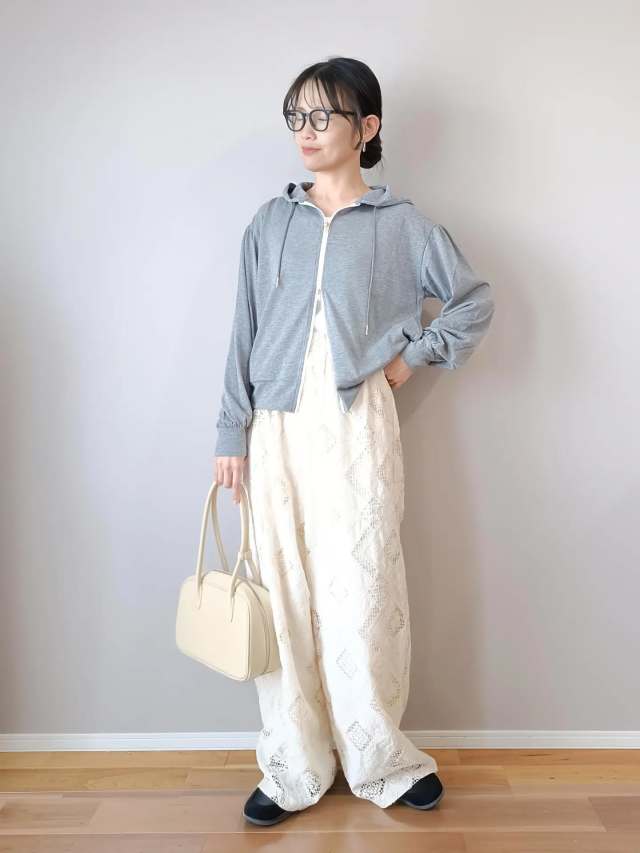 ロブ~ロングヘアの場合、「パーカーで髪を下ろすとバランスが難しい」と感じる方も多いかもしれません。どうしても髪がフードにかかってまとまらないのが難点ですよね。でもちょっと工夫すれば、大人っぽく上品なカジュアルスタイルが楽しめるんです。