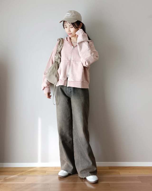 カジュアルなパーカーは帽子とも相性抜群! ヘアスタイルがまとまらないときは、おしゃれな帽子に頼るのも得策です。