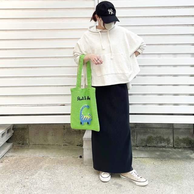スナップは、まとめ髪にキャップをプラスしたパーカースタイル。パーカーとキャップはカジュアルなアイテム同士なのでおしゃれになじみます。髪をまとめると首元がすっきりしてコーデしやすいですよ。