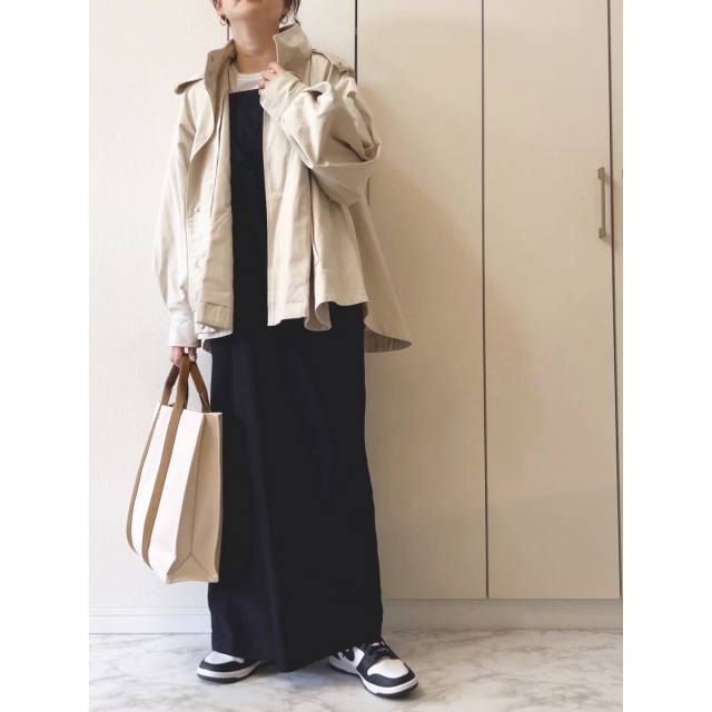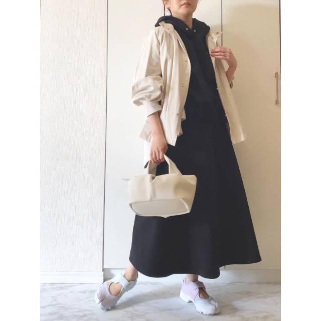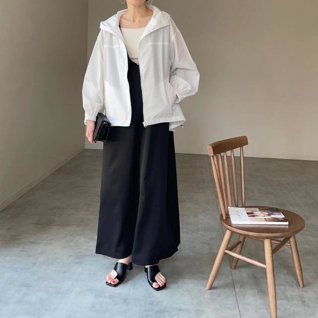 白マウンテンパーカー×キャミソールワンピースのコーデ