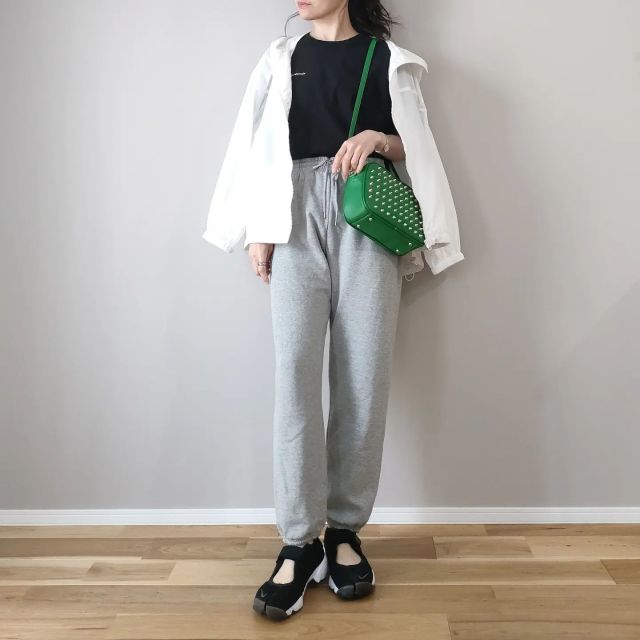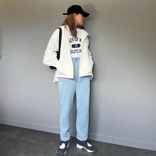 白マウンテンパーカー×スウェットパンツ・ジョガーパンツのコーデ