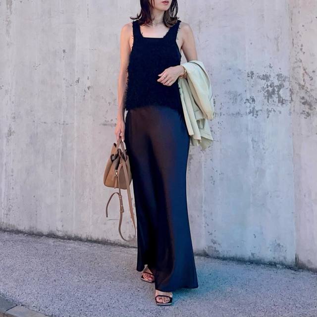 シンプルになりやすい夏のスカートコーデは、素材感をミックスして表情をつけると一気にシャレ見え。例えば黒のサテンスカートにシャギーな黒タンクトップを合わせれば、ワンカラーで奥行きのあるスタイリングに仕上がります。