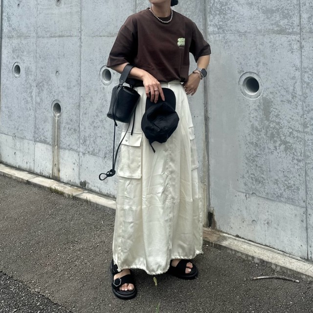 こちらではワンポイント入りのオーバーサイズTシャツに、カーゴタイプのサテンスカートを合わせてコーデ。カジュアルな雰囲気とリラックス感のあるシルエットは夏にぴったりです。