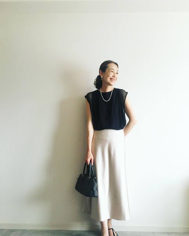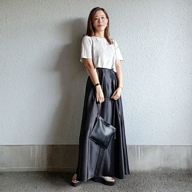本格的な夏がやってきたら、トップスは楽ちんなTシャツをチョイス。ラフでありながら、サテンスカートのツヤ感のおかげで程よくきれいめに決まるのが大人に嬉しい組み合わせです。