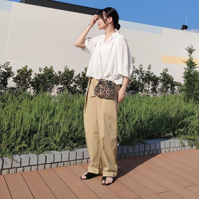 次にご紹介するのはベーシックなベージュのチノパンツ。このパンツはいま主流となっているワイドシルエットを選ぶのがおすすめです。