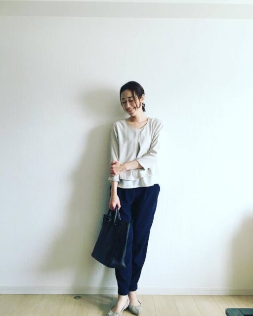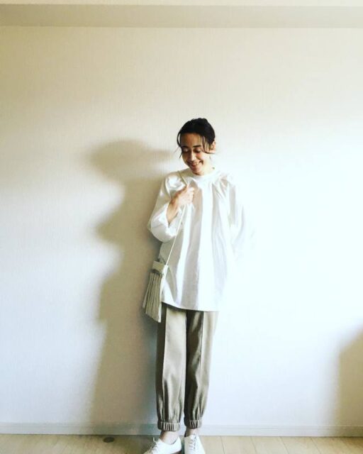 スポーティなジョガーパンツには「裾出しがサマになるブラウス」を合わせましょう。トップスアウトで着ることで、ウエストゴムがすっぽり隠れてジョガーパンツの部屋着っぽさを解消。お腹まわりもさりげなくカバーしてくれますよ。