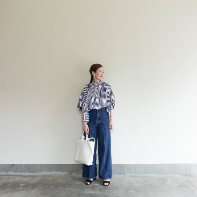 王道のデニムパンツにブラウスを合わせるとき、イチ押しなのが「ハイネックブラウス・ボウタイブラウス」。襟高や襟元に装飾性のあるブラウスは視線を上に集めて、顔まわりも華やぐ優れモノ。これならゆったりとしたデニムパンツにブラウスの裾をインしてもお腹まわりが目立たず、クリーンな印象で着こなせますよ。