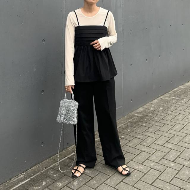 特におすすめなのが白シアープルオーバー×黒キャミソールの組み合わせ。パキッとしたモノトーンカラーでまとめることで、大人っぽい装いに。