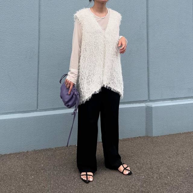 シアープルオーバーの重ね着にぴったりなのが「ベスト・ジレ」。上に着るだけでプルオーバーの透け感を程よくカバーしてくれます。しかもシアープルオーバーはシンプルなことが多いので、ベスト・ジレはどんなデザインでもOK。